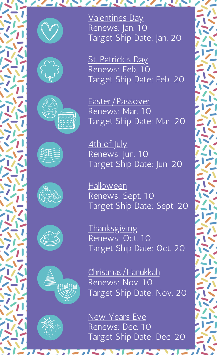 A: We renew on the 10th of the shipping month. We aim to ship around the 20th of each month. While this date may vary at times, rest assured you will receive your box in plenty of time before the upcoming holiday.